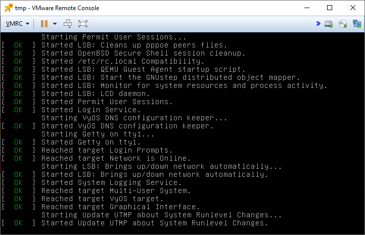vyos@vyos:~$ show system image The system currently has the following image(s) installed: 1: 1.2-rolling-201908230337 2: 1.2-rolling-201908210337 (default boot) vyos@vyos:~$ show dhcp client leases interface eth0 interface : eth0 ip address : 192.168.122.10 [Active] subnet mask: 255.255.255.0 router : 192.168.122.1 name server: 192.168.122.1 dhcp server: 192.168.122.1 lease time : 3600 last update: Fri Aug 23 07:45:16 UTC 2019 expiry : Fri Aug 23 08:45:15 UTC 2019 reason : REBOOT vyos@vyos:~$ cat /etc/resolv.conf ### Autogenerated by host_name.py ### nameserver 192.168.122.1