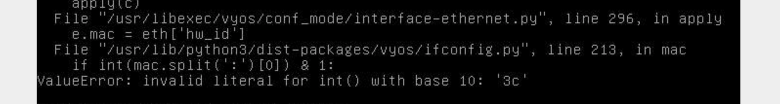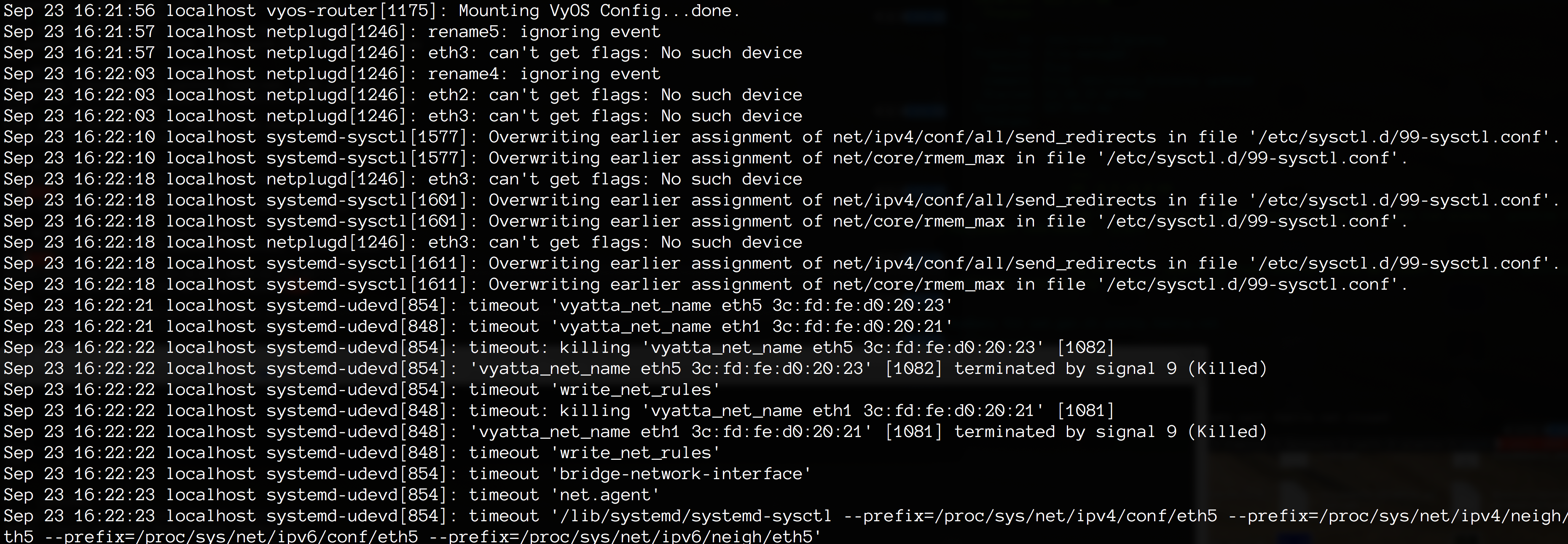 First boot into 201909231545 took about 20 minutes for VyOS to be pingable. It was clear that eth1 and eth3 were not the right devices. Looking through logs gave all sorts of mess: