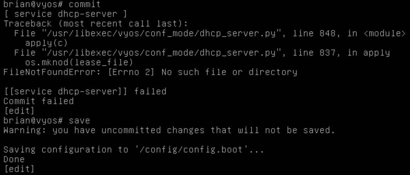If you do a clean install of vyos "vyos-1.2-rolling-201910110117-amd64.iso" as of right now that's the latest rolling release, DHCP configuration will fail to save.