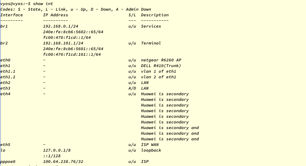 vyos@r-roll:~$ /usr/libexec/vyos/op_mode/show_interfaces.py --action=show-brief Codes: S - State, L - Link, u - Up, D - Down, A - Admin Down Interface IP Address S/L Description --------- ---------- --- ----------- dum0 10.0.0.1/24 u/u Huawei is secondary home router Telecom special edition switching and AP mode