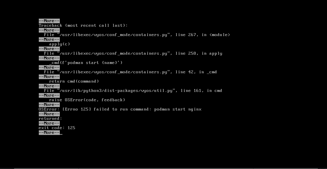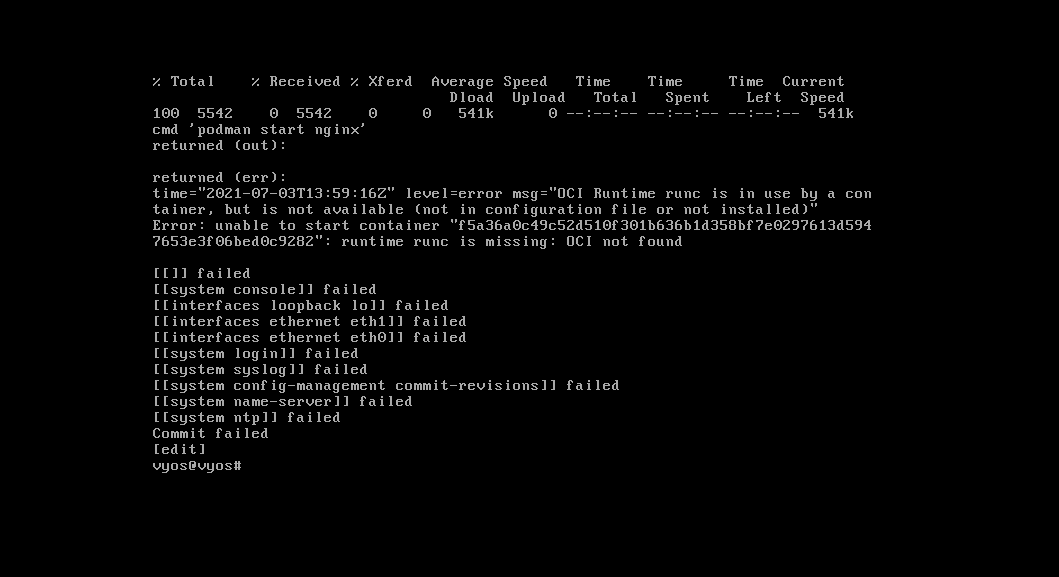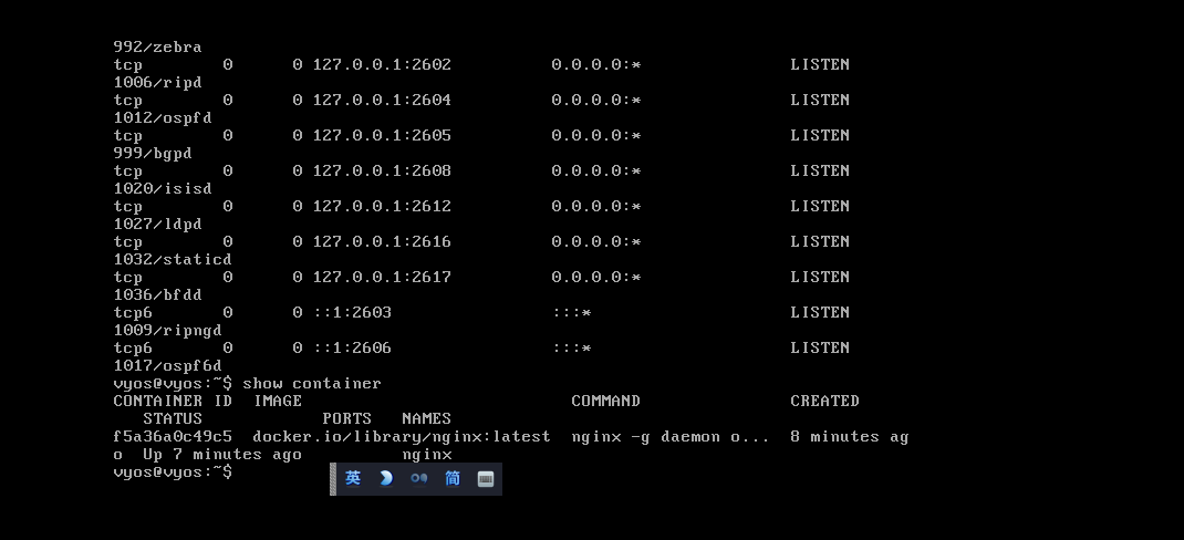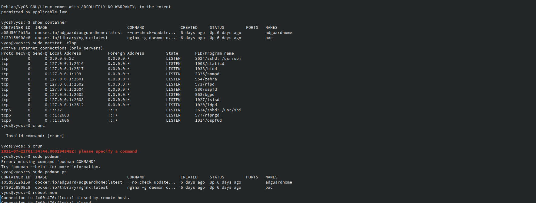 set interfaces ethernet eth0 address dhcp set interfaces ethernet eth0 ipv6 address autoconf set system name-service 114.114.114.114 set container name nginx image nginx set container name nginx allow-host-networks commit save exit