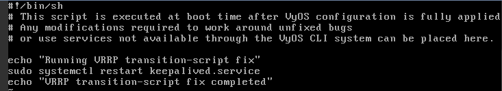 - Delete VRRP configuration entirely on both machines OR remove the transition-script line, add again, save - then everything works again.