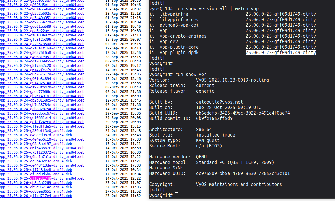 vyos@r14# run show version all | match vpp ii libvppinfra 25.06.0-25~gff09d1749-dirty amd64 Vector Packet Processing--runtime libraries ii libvppinfra-dev 25.06.0-25~gff09d1749-dirty amd64 Vector Packet Processing--runtime libraries ii python3-vpp-api 25.06.0-25~gff09d1749-dirty amd64 VPP Python3 API bindings ii vpp 25.06.0-25~gff09d1749-dirty amd64 Vector Packet Processing--executables ii vpp-crypto-engines 25.06.0-25~gff09d1749-dirty amd64 Vector Packet Processing--runtime crypto engines ii vpp-dev 25.06.0-25~gff09d1749-dirty amd64 Vector Packet Processing--development support ii vpp-plugin-core 25.06.0-25~gff09d1749-dirty amd64 Vector Packet Processing--runtime core plugins ii vpp-plugin-dpdk 25.06.0-25~gff09d1749-dirty amd64 Vector Packet Processing--runtime dpdk plugin [edit] vyos@r14# [edit] vyos@r14# run show ver Version: VyOS 2025.10.28-0019-rolling Release train: current Release flavor: generic