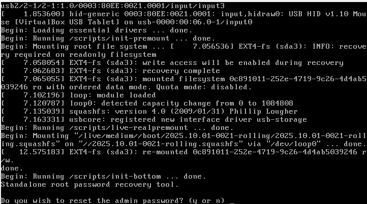 The current password recovery (as of rolling release 2025.10.01) flow is outlined in the following screenshots: